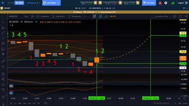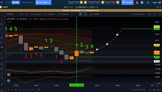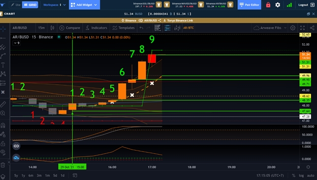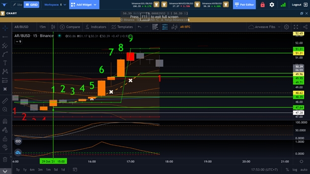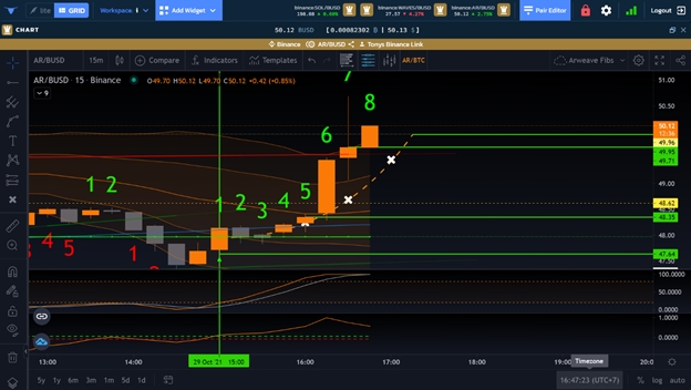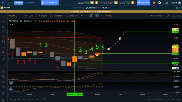 The first green vertical line represents the candle we already knew we wanted to take the trade on, as we could already see the BGMC was likely to cross in, the price value for that candle was likely to fire on the green AX Line, and the Stoch RSI was coming into the 20 range.