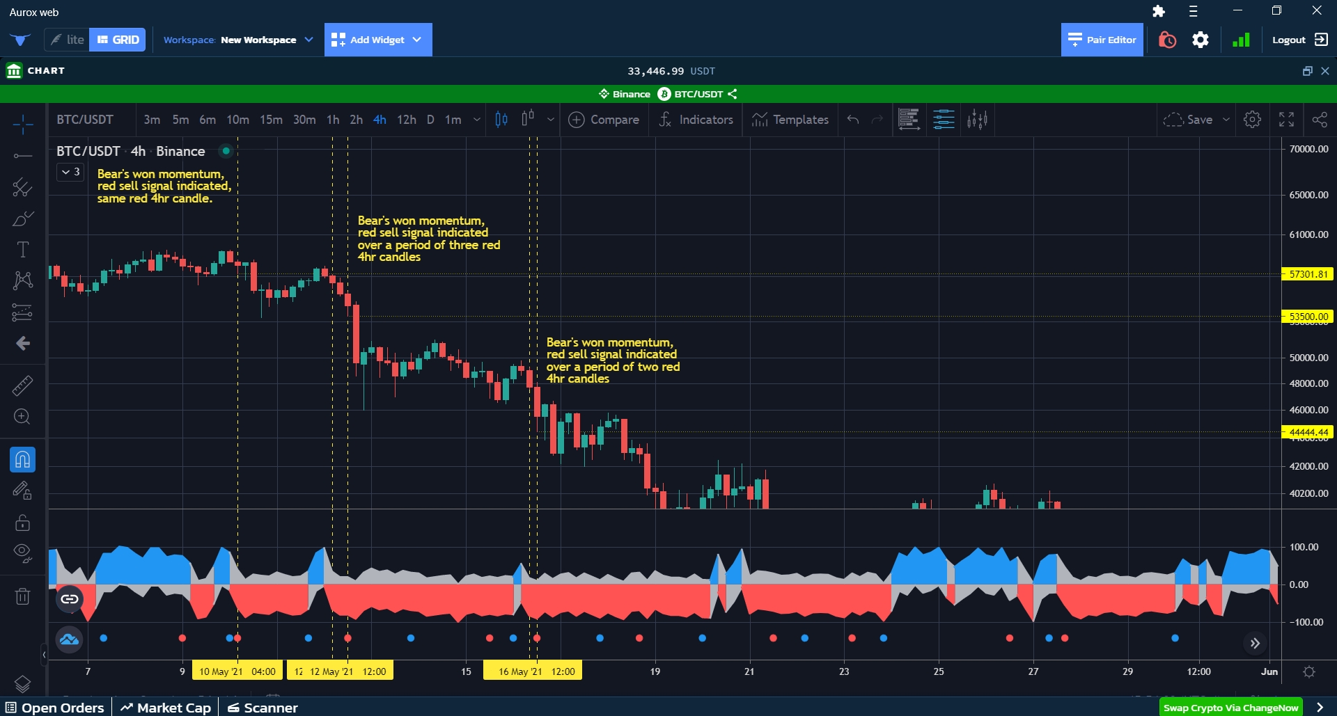 If you see the first dotted vertical line you see that the bulls lost their momentum, as the blue wave has now turned red, the candles are red, and a red possible sell circle has printed.